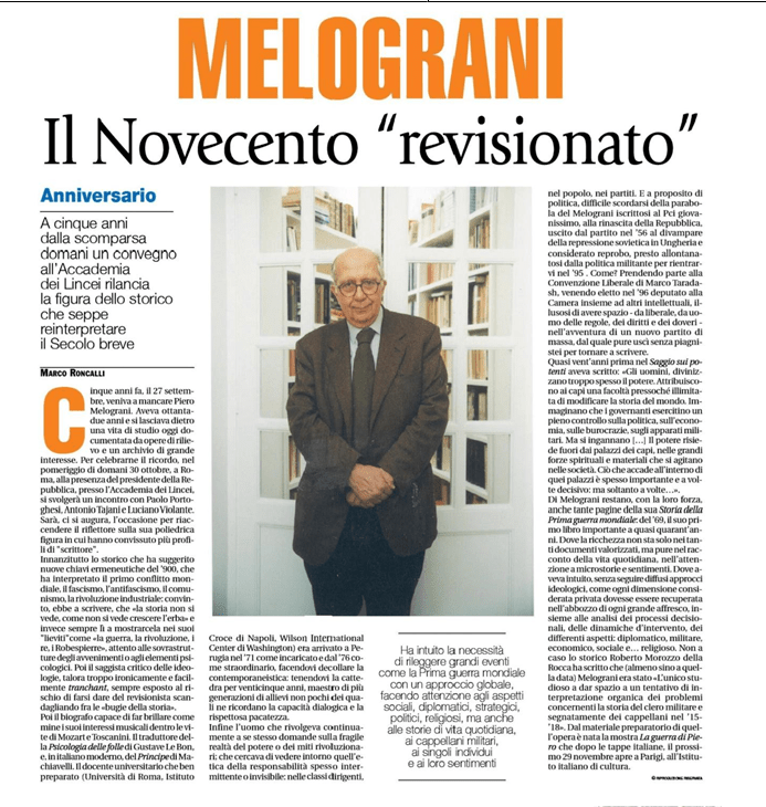 Piero Melograni sarà ricordato oggi all’Accademia Nazionale dei Lincei, a Roma, nel corso di un evento al quale sarà presente anche il Capo dello Stato Sergio Mattarella. L’appuntamento sarà introdotto dal saluto dell’architetto Paolo Portoghesi e vedrà prendere la parola anche l’ex presidente della Camera dei Deputati – e fondatore dell’Associazione Italiadecide – Luciano Violante. Il tutto intervallato dagli interventiContinua a leggere “Accademia Lincei. Tutte le iniziative per ricordare lo storico Piero Melograni”